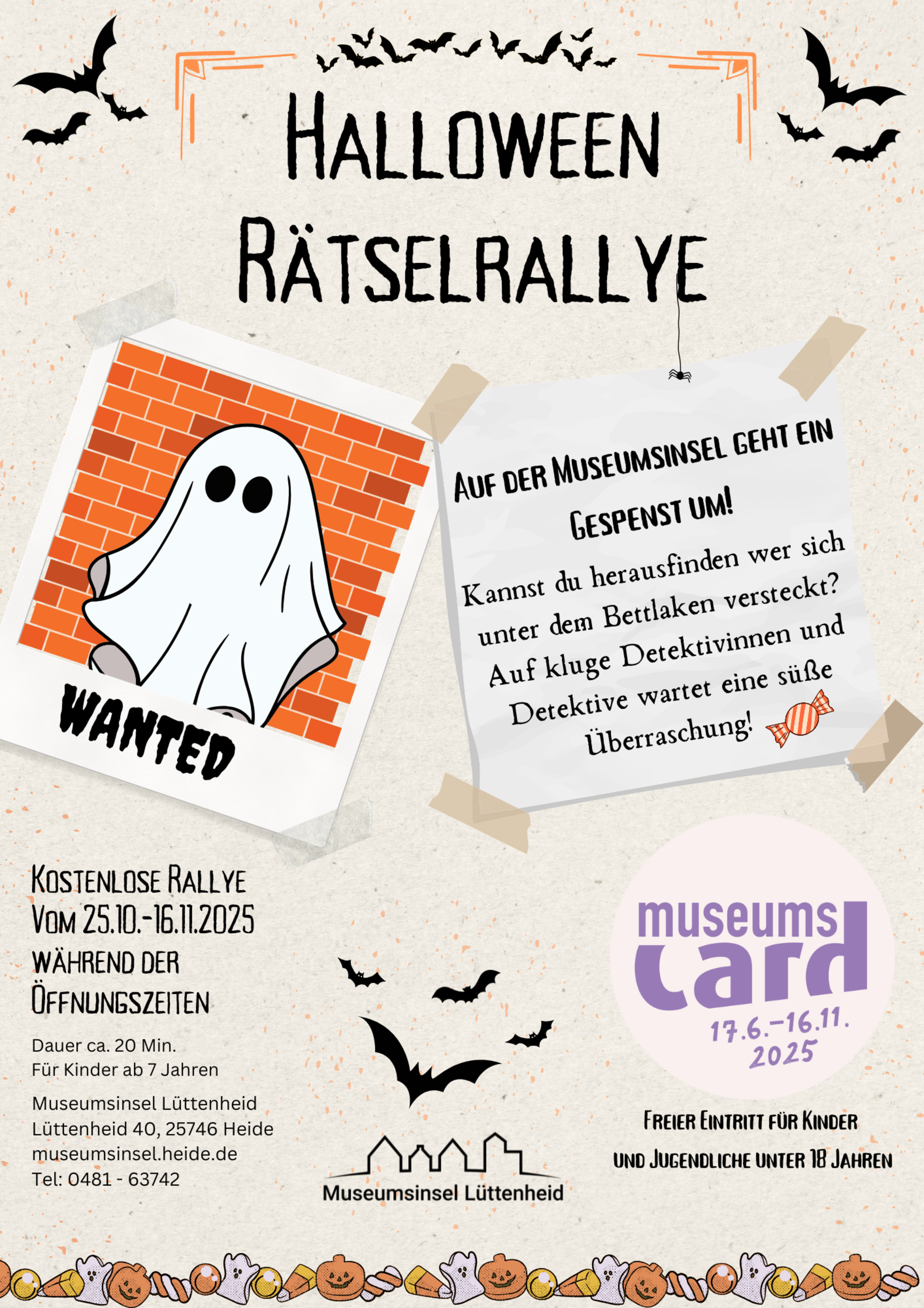 Es spukt auf der Museumsinsel Lüttenheid. Ein Gespenst geht um, aber wer versteckt sich unter dem Bettlaken? Haben sich die Katzenjammer Kids einen neuen Streich ausgedacht oder sucht der Heider Maler Nicolaus Bachmann die Ausstellungsräume heim? Im Oktober und November können sich kleine Detektivinnen und Detektive im Museum auf Spurensuche begeben, um die Identität des Gespensts zu enthüllen. Am Ende der Rallye wartet eine süße Überraschung.