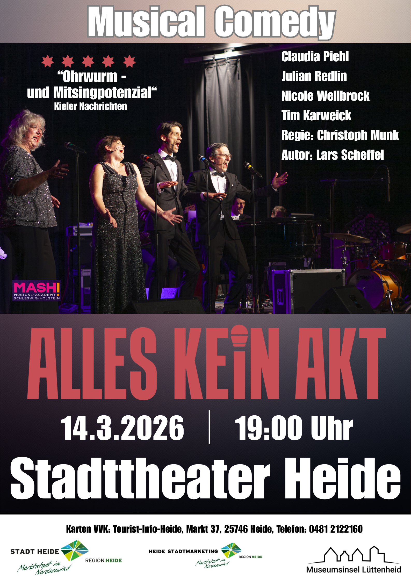 „Alles kein Akt“ ist eine spritzige Musical Comedy voller schrägem Humor, jazziger Musiknummern und überraschender Wendungen. Das Stück erzählt von persönlichen und gesellschaftlichen Gräben, von schlecht verheilten Wunden und davon, wie schwierig es ist, miteinander statt übereinander zu sprechen. Und davon, wie Musik und Improvisation Menschen wieder verbinden können.